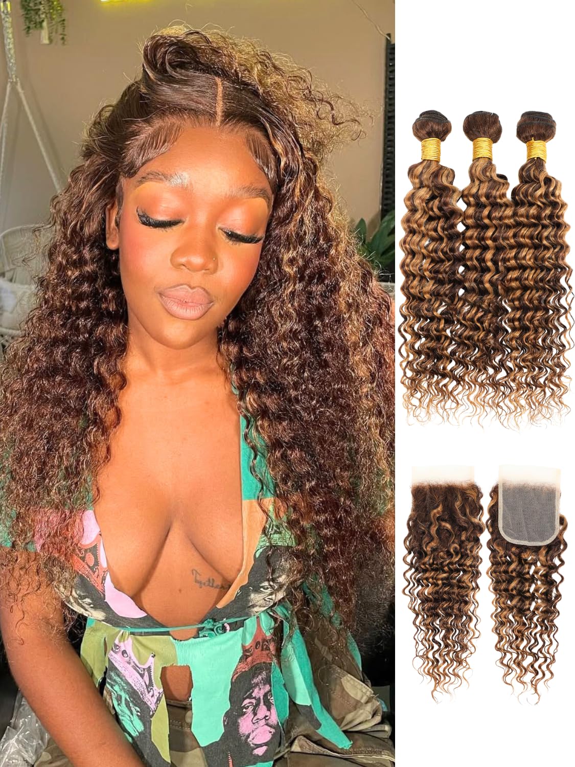 - Gorgeous Ombre Honey Blonde Color: Transform your look with our p4/27 curly human hair bundles and frontal, featuring a stunning blend of 30% gold honey blonde and brown, captivating highlights create an enchanting, shiny look that seamlessly blends with your natural hair. Perfect for a chic, modern style! NOTE: It may appear darker when received but lighten to a beautiful highlighted ombre once styled!